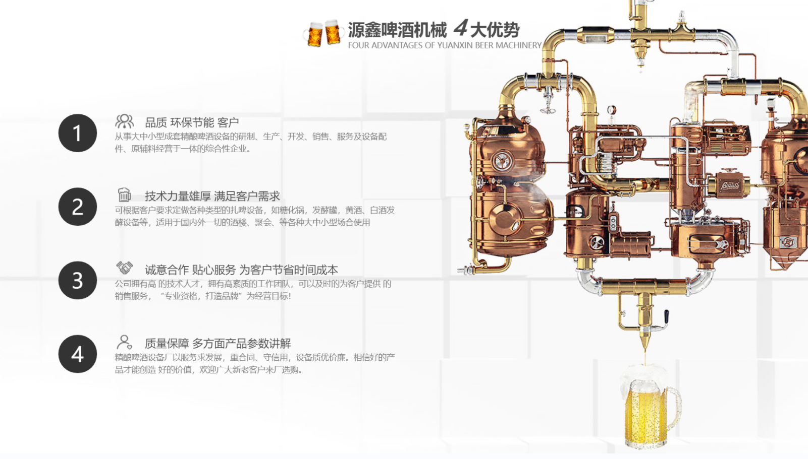 南陽市源鑫啤酒機械設(shè)備有限公司位于歷史文化名城一-南陽,從事大中小型成套啤酒、白酒自釀設(shè)備的研制、生產(chǎn)、開發(fā)、銷售、服務及設(shè)備配件、原輔料經(jīng)營于一體的綜合性企業(yè)。公司可根據(jù)客戶要求定做各種類型的扎啤設(shè)備,如糖化鍋,發(fā)酵罐,黃酒、白酒發(fā)酵設(shè)備等,適用于國內(nèi)外一切的酒樓、餐廳、家庭.聚會、酒吧等各種大、中、小型場合使用。公司擁有技術(shù)人才,擁有高素質(zhì)的工作團隊,可以及時的為客戶提供**的銷售服務。公司以“專業(yè)資格,打造品牌”為經(jīng)營目標,“卓越質(zhì)量,信賴價格”為經(jīng)營宗旨,以質(zhì)量求生存,以服務求發(fā)展,重合同、守信用,設(shè)備質(zhì)優(yōu)價廉。相信好的產(chǎn)品才能創(chuàng)造 好的價值,歡迎廣大新老客戶來廠選購。...